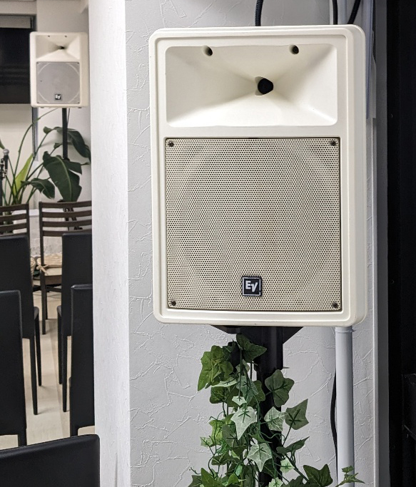 なお、礼拝堂には、前には12インチの白いスピーカーが、そして、後ろには8インチの白いスピーカーがあります(笑)